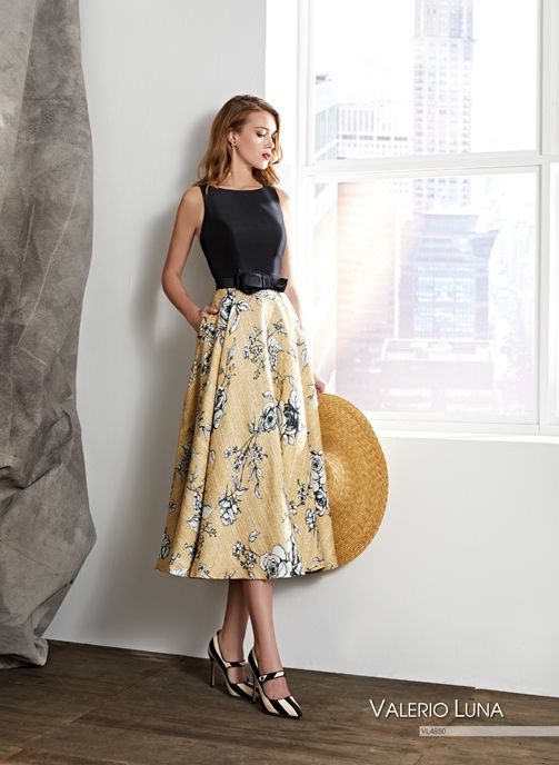 Vestido de largo midi con falda de capa en tejido rustico estampado, está cortado en la cintura adornada con una lazada. El cuerpo a la sisa de escote barco en pique de seda con original escote en la espalda.