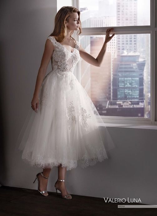 Vestido de largo midi en encaje con superposiciones de capas de tul empolvando con aplicaciones de encaje y bajo rematado con blonda. El cuerpo delantero es en forma de "V" de chantilly transparente y aplicaciones de guipur, la espalda es abierta con un amplio escote cuadrado también con aplicaciones.