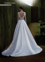Este elegante vestido de costura está confeccionado en un brocado de seda con motivos florales, muy favorecedor. Es un diseño de corte princesa largo, con un cuerpo que se ajusta al talle con exquisita feminidad. Su escote en pico y sus sencillos tirantes, compensan el amplio escote de la espalda con la transparencia de la blonda en la cintura, dejando paso a una amplia falda tableada con bolsillos y una gran cola.