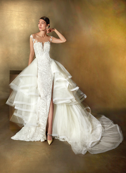 Destacan en estos diseños únicos las sobrefaldas de diferentes volúmenes, confeccionadas en jacquard y piqué de seda, adornadas con amplias lazadas y aplicaciones florales. Una colección diversa de exquisitos tejidos elegantes, encajes con aplicaciones de cristal, tules de brillo y detalles bordados que representan la esencia de la marca.