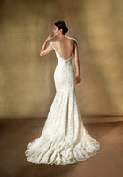 Descubre este vestido de novia juvenil y lleno de encanto de dos piezas de silueta sirena. Está confeccionado en pedrería y tul de brillo. El cuerpo bordado muestra un amplio escote ilusión abierto, rematado con aplicaciones florales que recorren bordeando todo el escote hasta el final de la espalda abierta. Este espectacular vestido se compensa con una sobrefalda de tul echa a cascadas de volantes superpuestos, haciendo de este conjunto un diseño espectacular que sorprenderá a todos tus invitados.